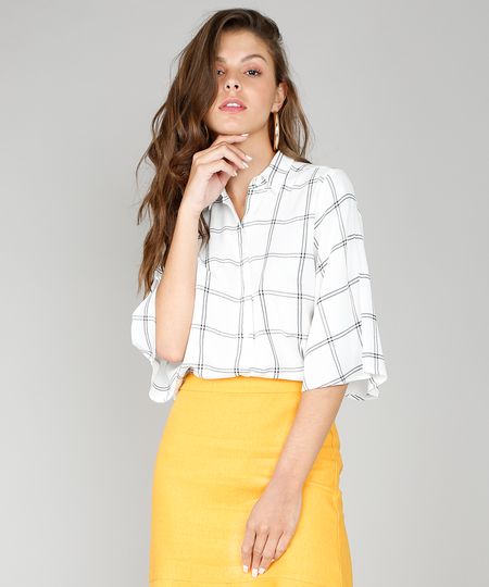 - Camisa Feminina Cropped Estampada Quadriculada Manga 3/4 Off White